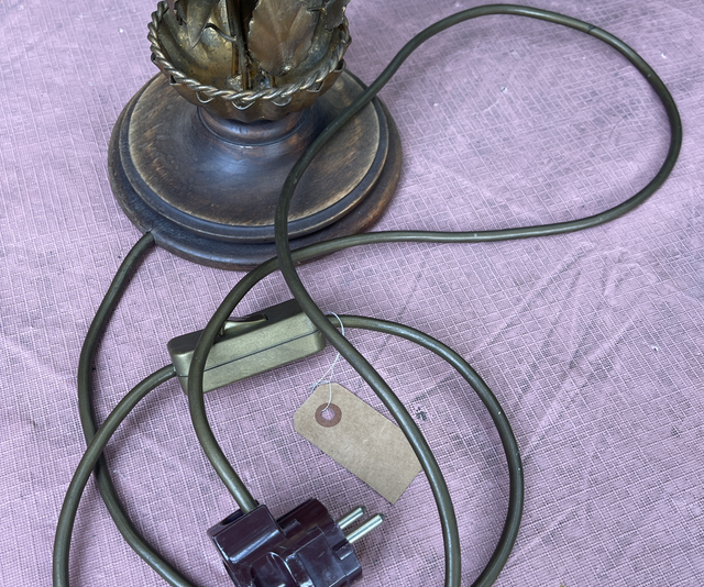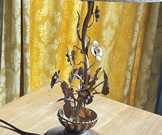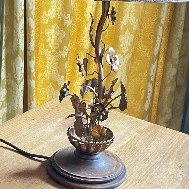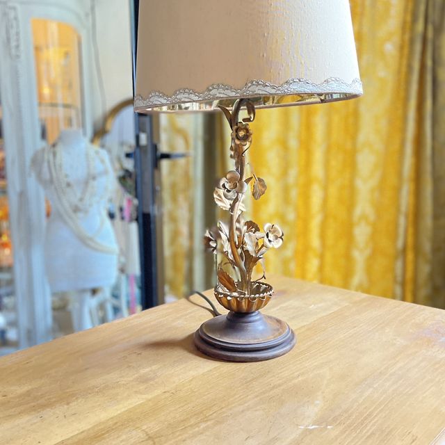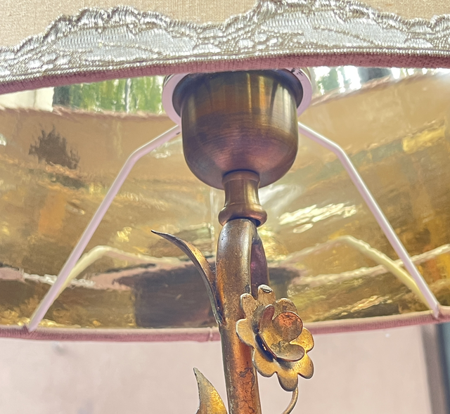 Zauberhafte florentiner Tischleuchte im Hollywood-Regency Stil, auf einem gedrechseltem Holzsockel montiert und mit Blumen und Blättern verziert . Feuervergoldung