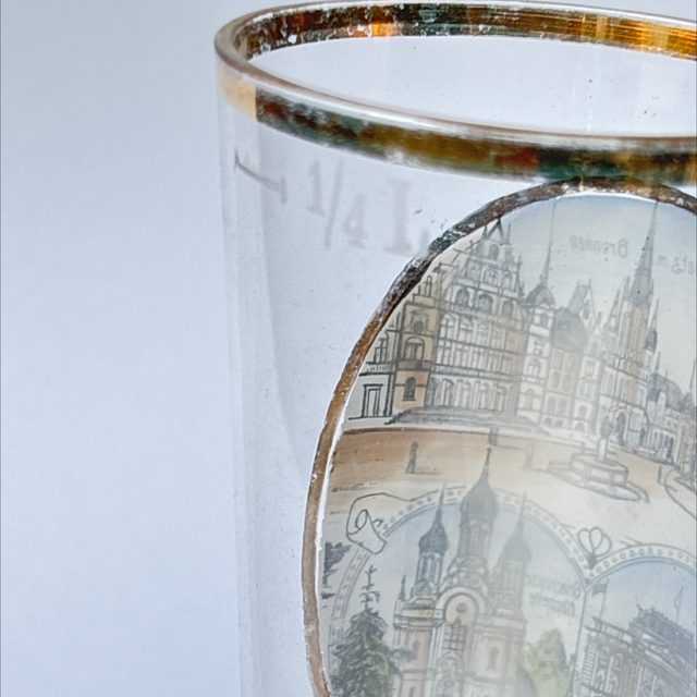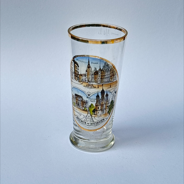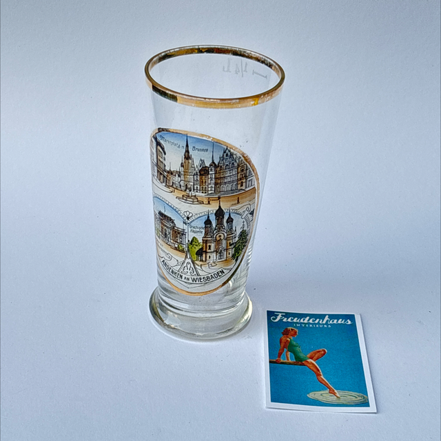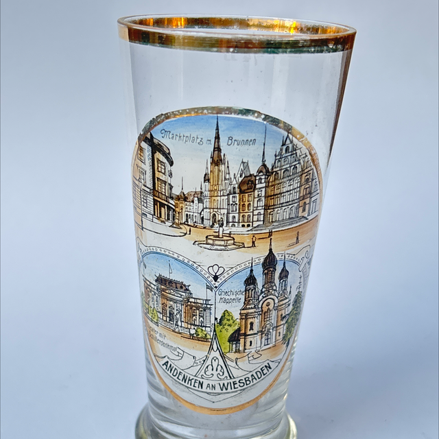 Antikes Souvenirglas mit Bildern aus Wiesbaden. Heiße Quellen, Brunnenwasser