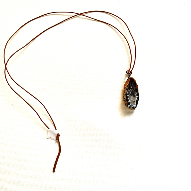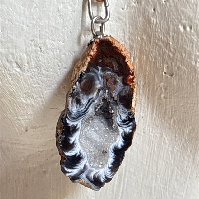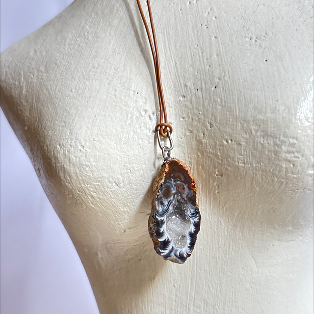 Druse Anhänger aus Achat, Jahrtausende alt. Ein Hohlraum, der mit Kristallen gefüllt ist. Mineralstein. L: 4 cm , B: 1,5 cm