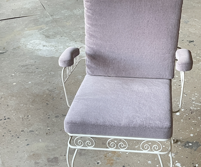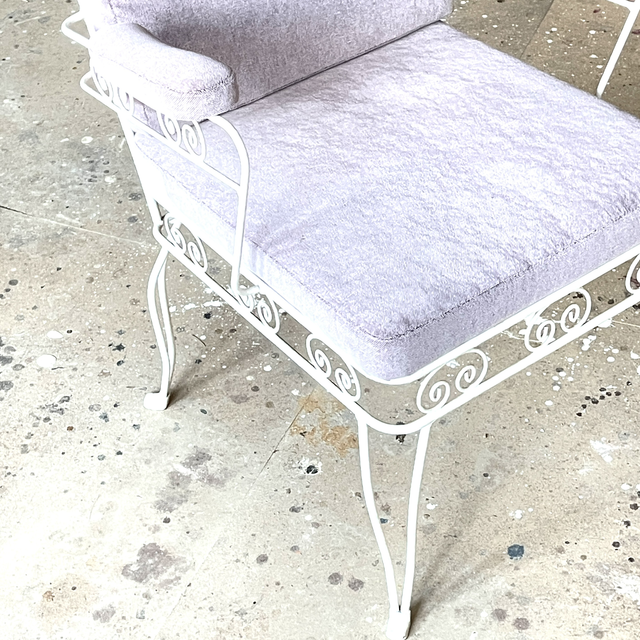 Weißer Metallstuhl , Armlehnstuhl , toll gepolstert duech 2 Auflagen. Gartenstuhl , Wintergartenstuhl, Mid-Century Armlehnstuhl.