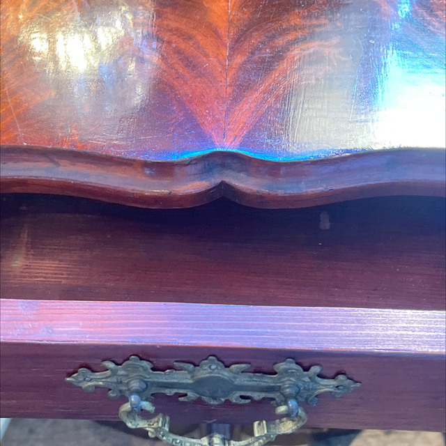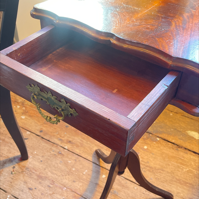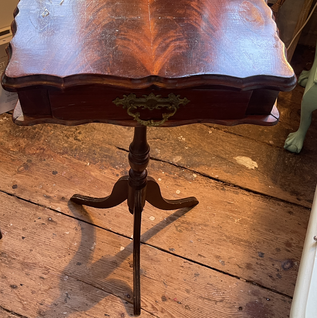 Tisch mit Schublade und abgeteilten Fächern in der Schublade. Antiker Nähtisch / Palisander lackiert. B: 43 cm T: 30 cm H: 72 cm