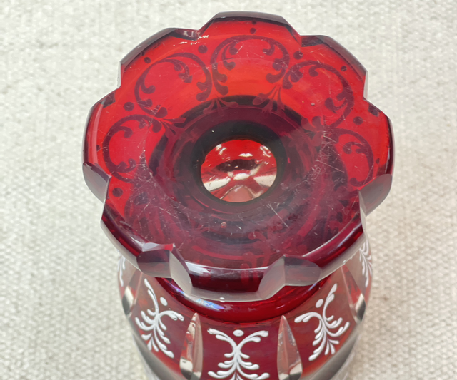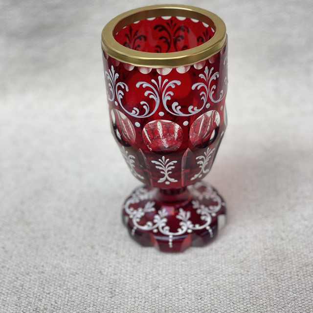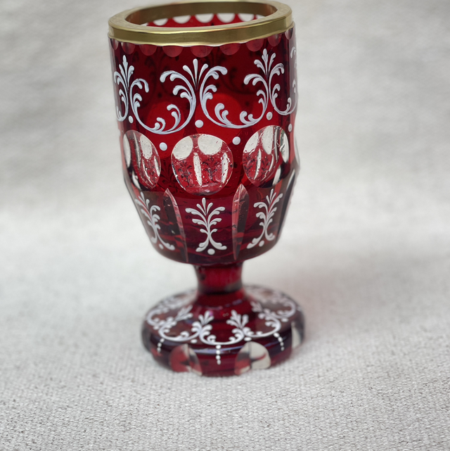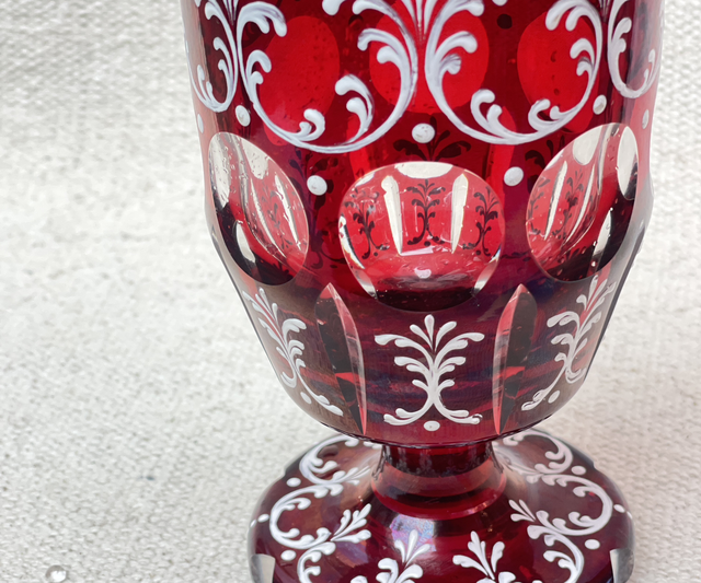 Antikes, handgeblasenes, Kristallglas, Weinglas oder Pokalglas. Das rubinrote entsteht durch Goldchlorid währen des Herstellungsprozesses . Das handgeschliffene Glas ist mit aufwendigen, floralen, weißen Emaille-Verzierungen versehen.