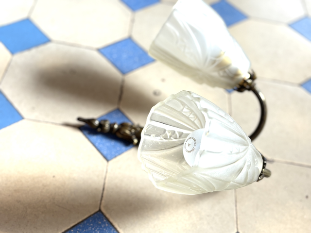 Art Déco Bronze Lampe für die Wand. Neu verkabelt. LED tauglich . Satinierte Doppelgläser, 2-flammig mit original geätzten Gläsern- mit typischen, feinen floralen Details.