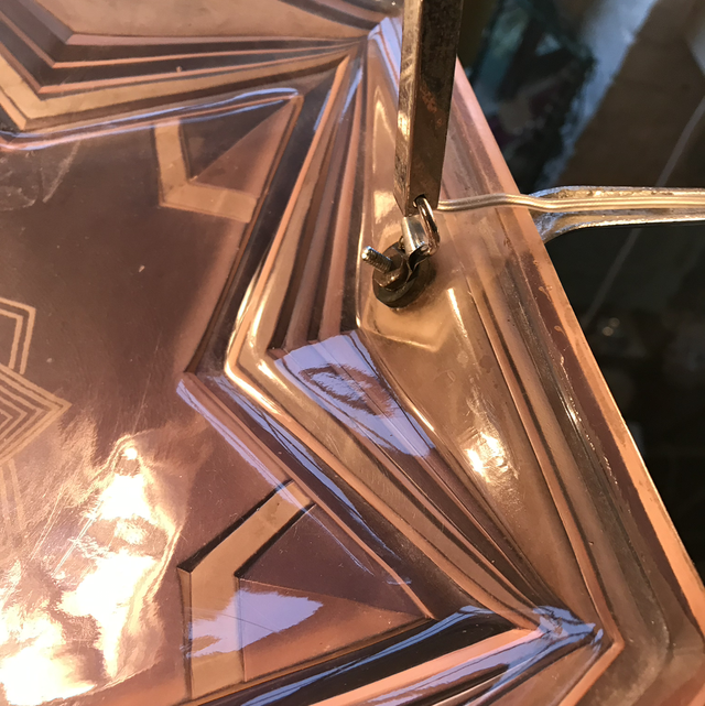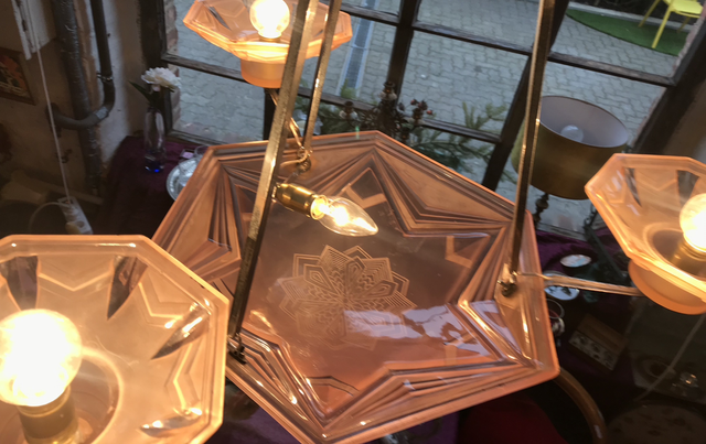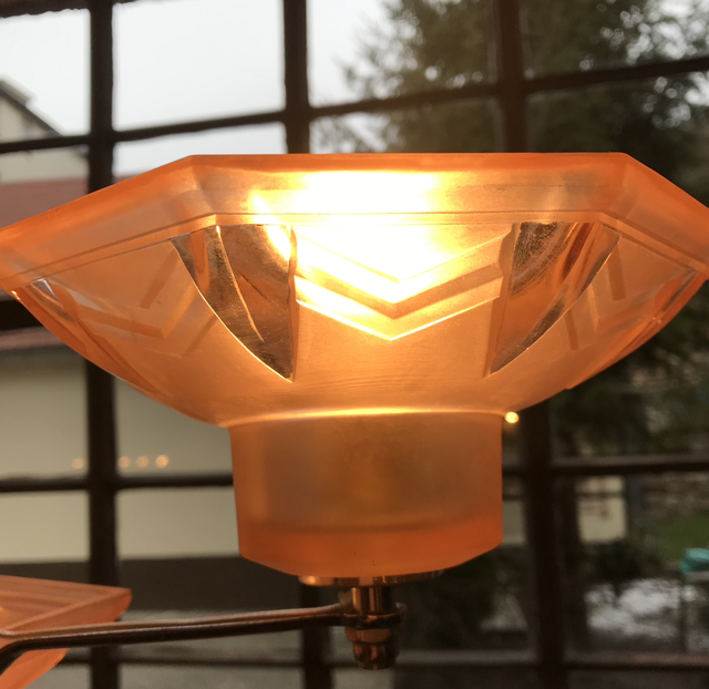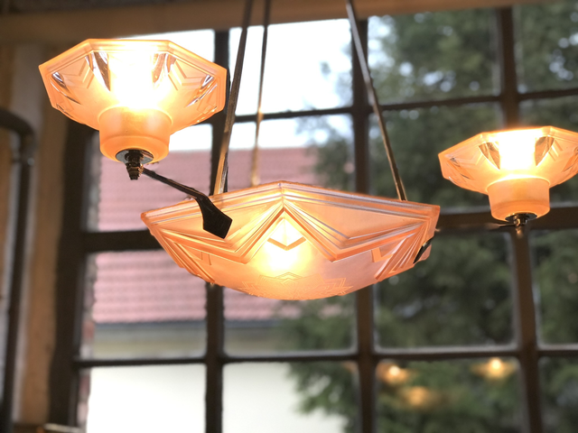 Diese seltene Art Déco Deckenleuchte ist ein echtes Sammlerstück - gefertigt in rosa Farben im strukturierten Glas und signiert von den renommierten Müller -Freres aus Luneville /Frankreich. Die originalgetreue neue Verkabelung sorgt für moderne Sicherheit ohne den authentischen Charakter zu beeinträchtigen. Die Kunst voll geschwungene Form und das warme Rosé Glas bringen Eleganz und Atmosphäre in jeden Raum. Perfekt als stilvoller Blickfang für Wohnzimmer, Esszimmer oder Eingangsbereich im Vintage oder Art- Déco - Stil.