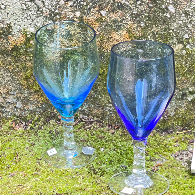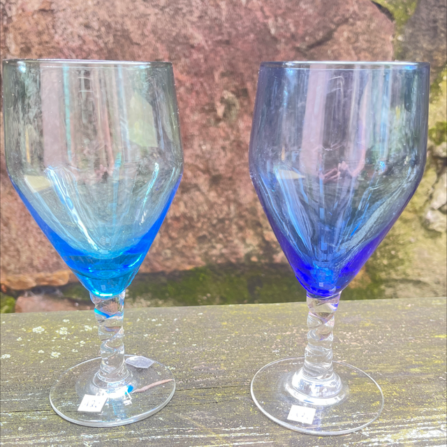 2 blaue Gläser mit unterschiedlichen Blautönen und gedrehten Glasfüßen