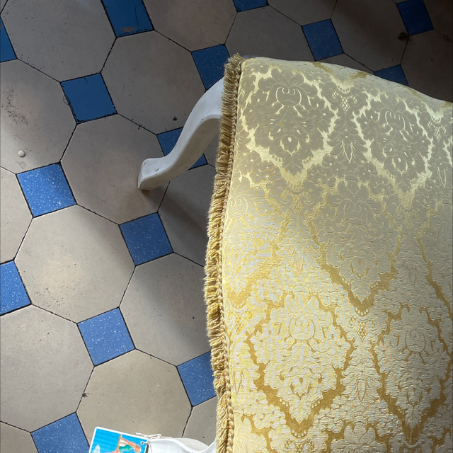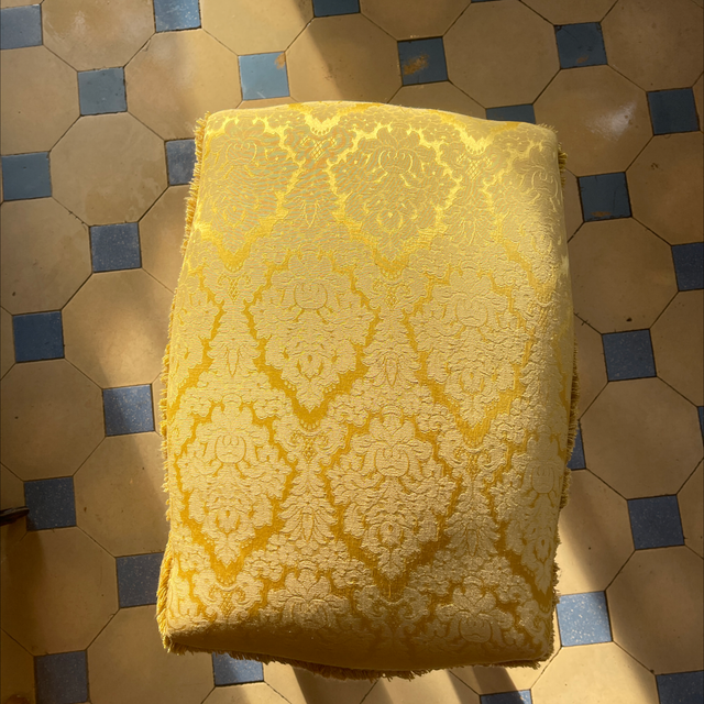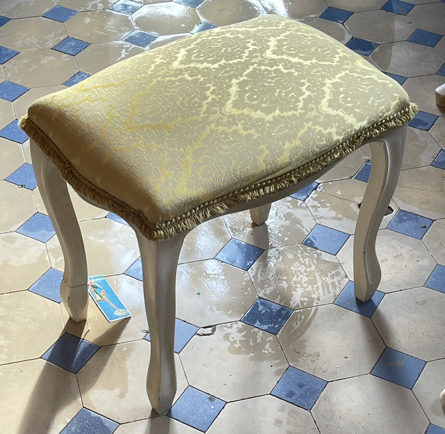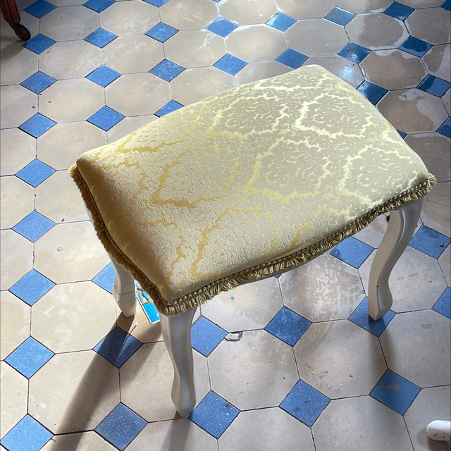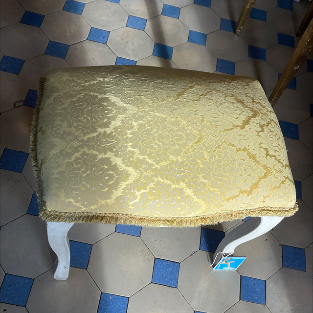 Restaurierter und gepolsterter Hocker, gepolstert mit gelbem Brokatstoff und mit gewollter Patina