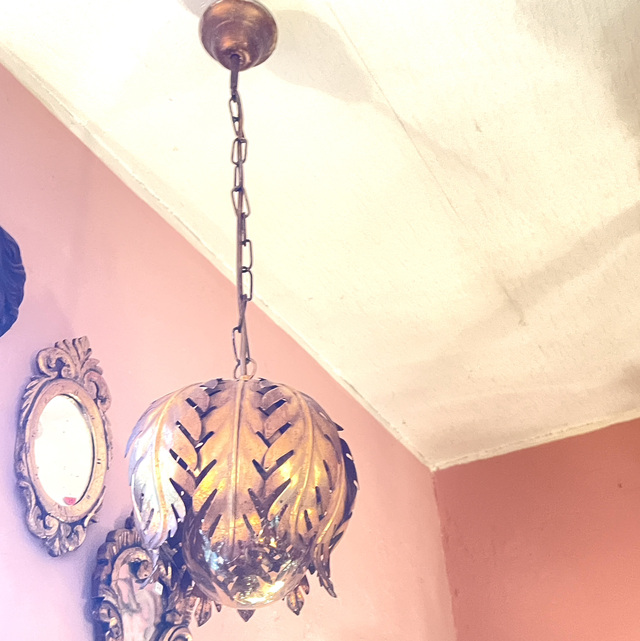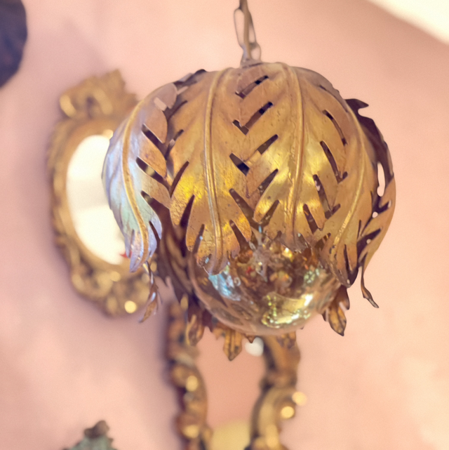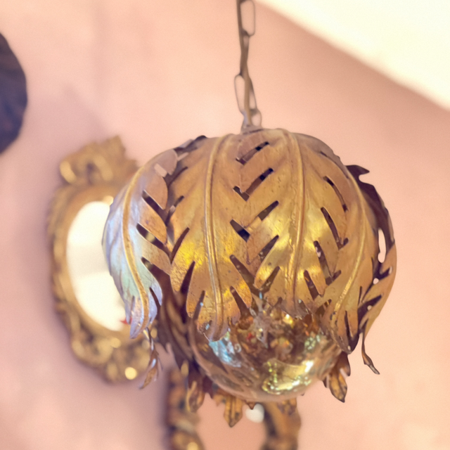 Pendelleuchte / Goldleuchte/ Kugellampe/ Geschmiedete Leuchte / Kugelige Blattleuchte mit großer Glühbirne / Hans Kögl/ Feulliage Doré/ 1960er Jahre/ Mid - Century