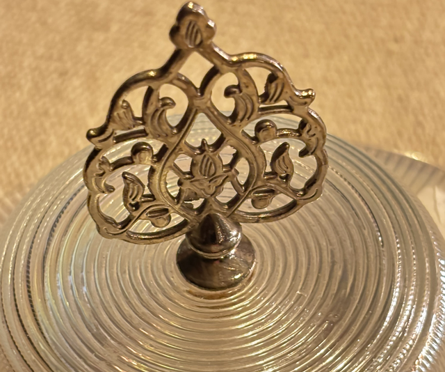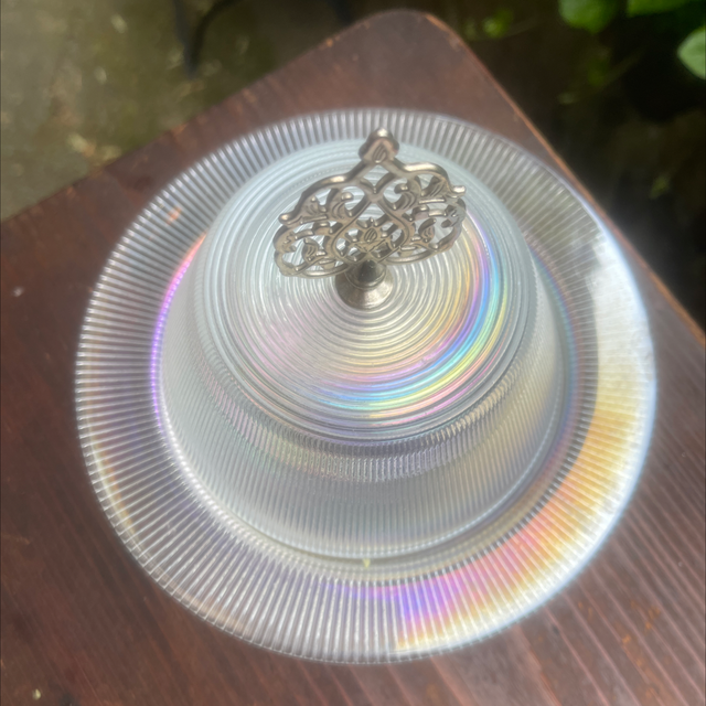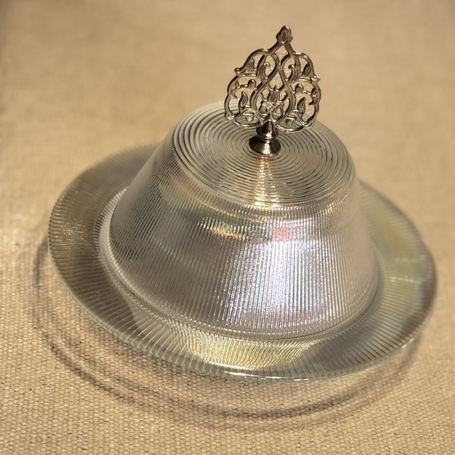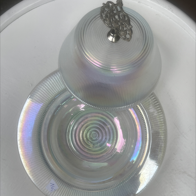 Käseglocke/ Deckeldose Glas irisierend mit Ornamenten Griff