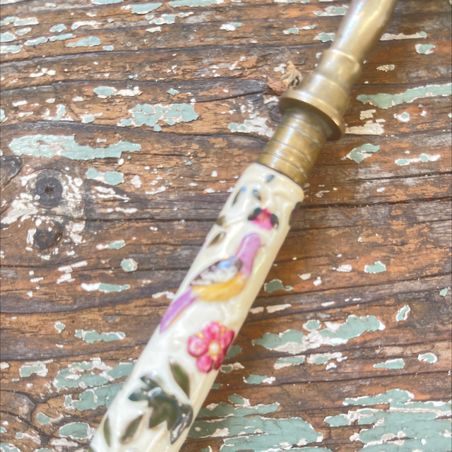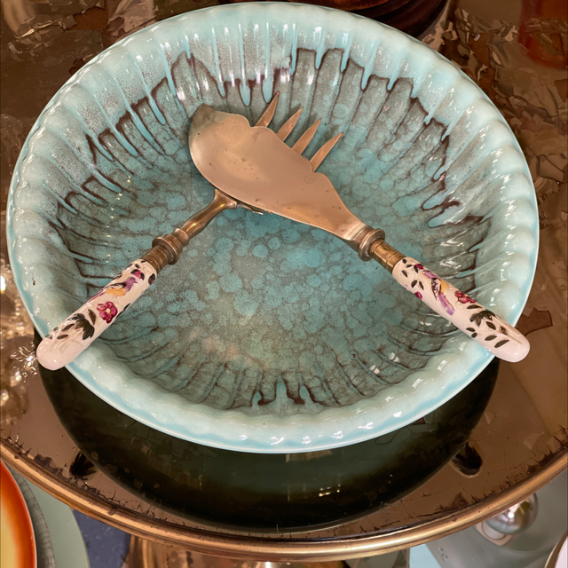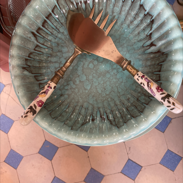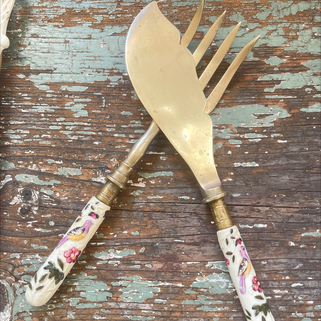 Großes Messer mit großer Keramik Gabel . Auf den Griffen gibt es Blumen und Vögel