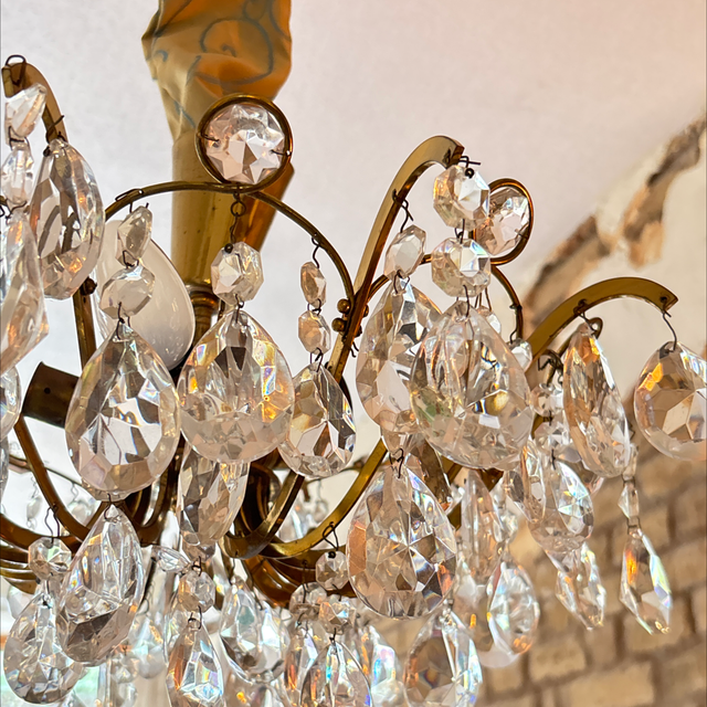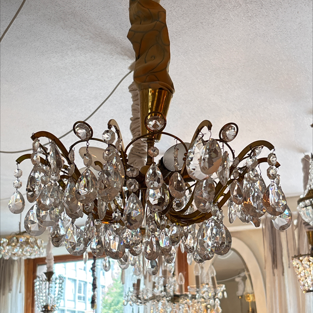 Mid-Century Kronleuchter mit Messing Corous und viel Behang aus Kristall. Durchmesser: 40 cm, H: 30 cm und 5-flammig