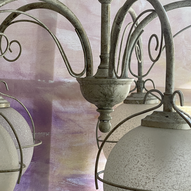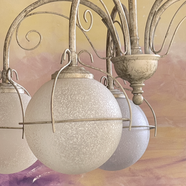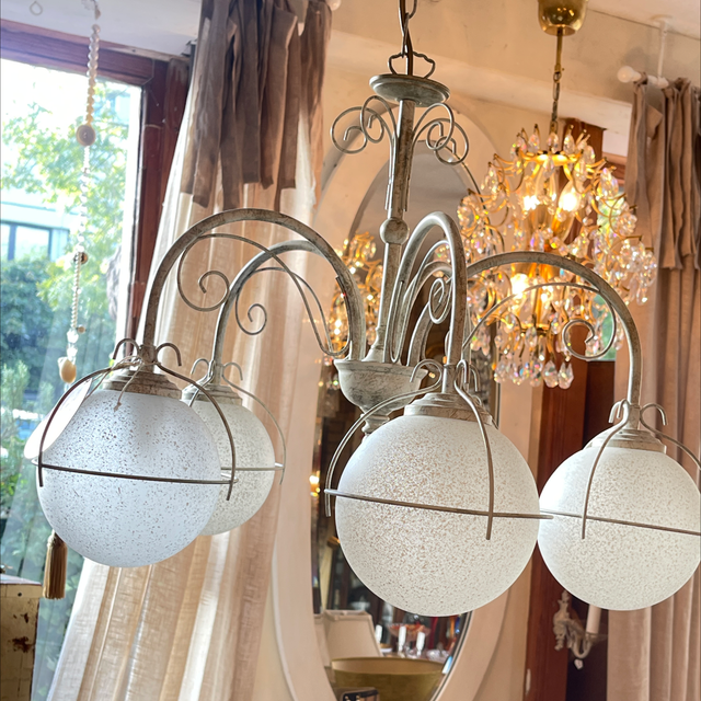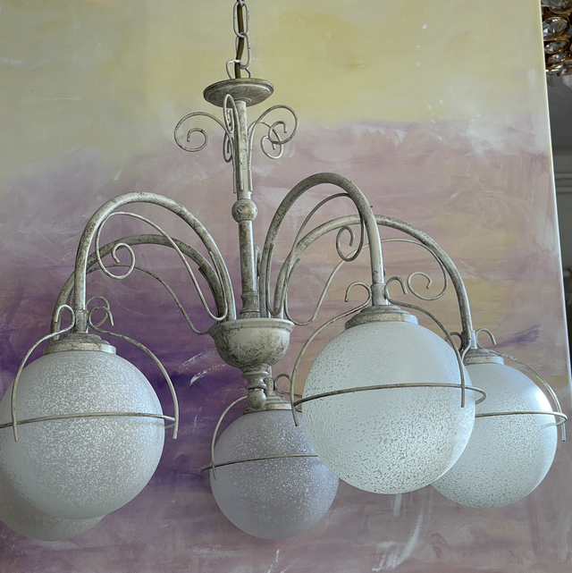Pendelleuchte / Kugellampe/ Deckenlampe mit 5 weißen, mattierten, runden Glasbällen. Der Corpus ist aus Metall und weiss lakiert