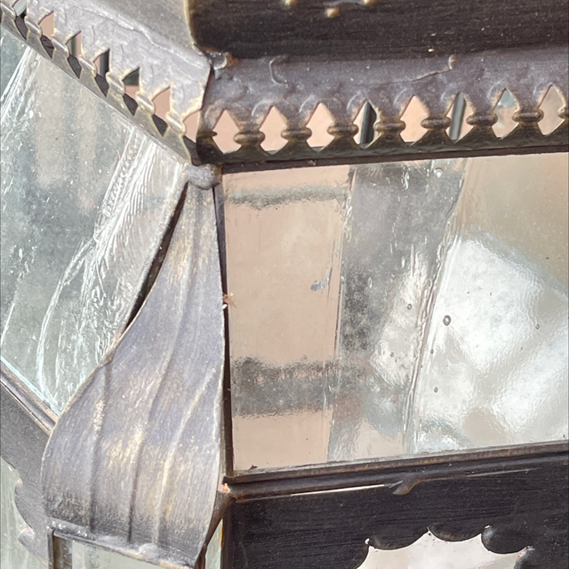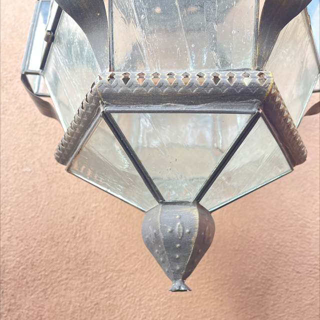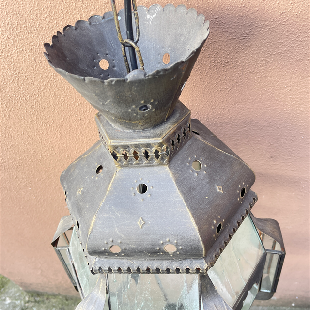 Laternen Deckenleuchte/ Metall antik Patio . Die antike Laterne hat mundgeblasene Glasscheiben,die mit kleinen Luftblasen und Unebenheiten weisen auf das Alter hin und ist somit authentisch. Due Pendelleuchte ist neu verkabelt . H: 82 cm, B: 36 cm