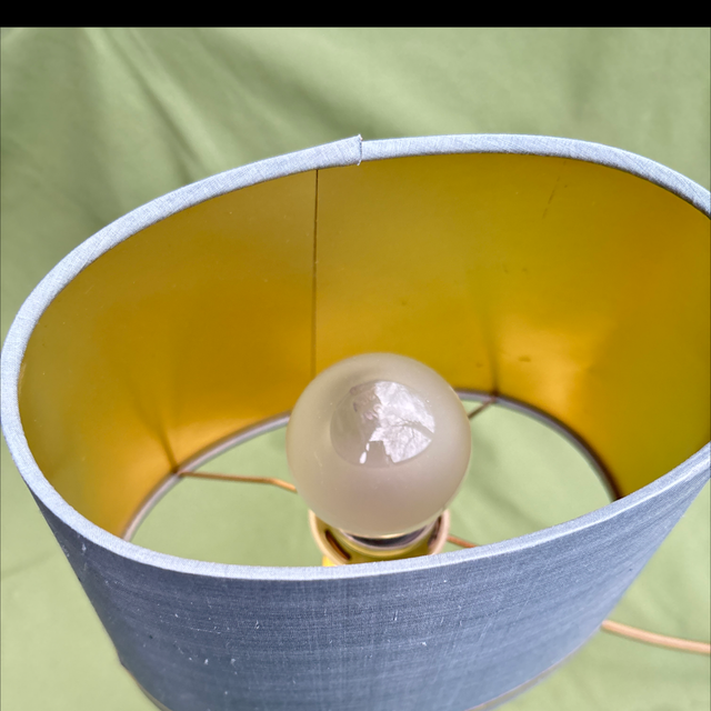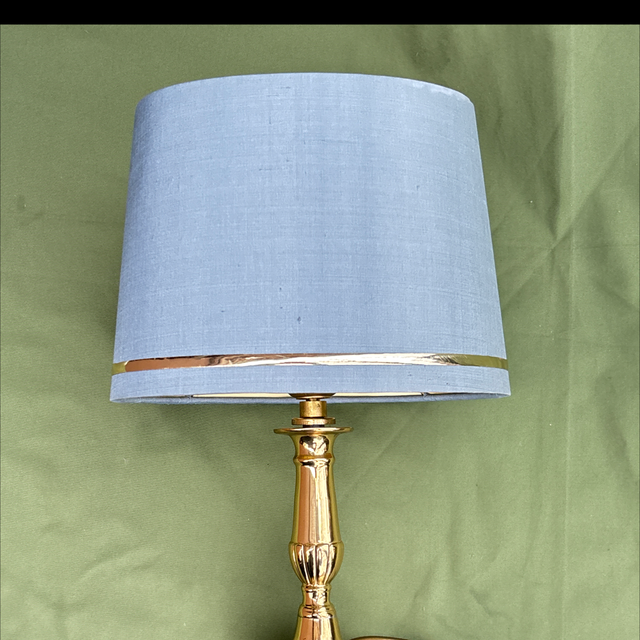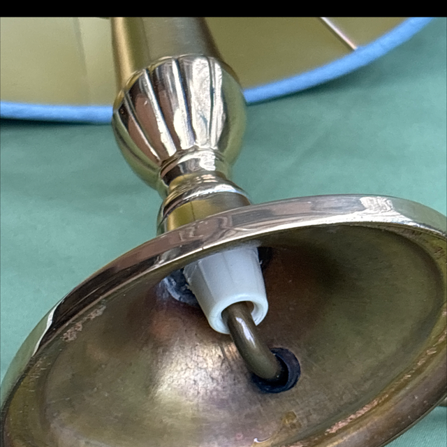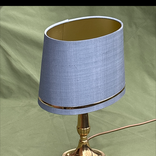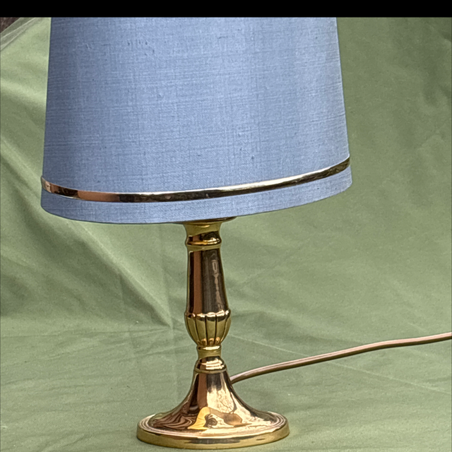 Messing Tischleuchte mit hellblauem Schirm der mit einer klaren Goldborde umrandet ist. Das Kabel vom Fuss bis Stecker ist 220 cm lang