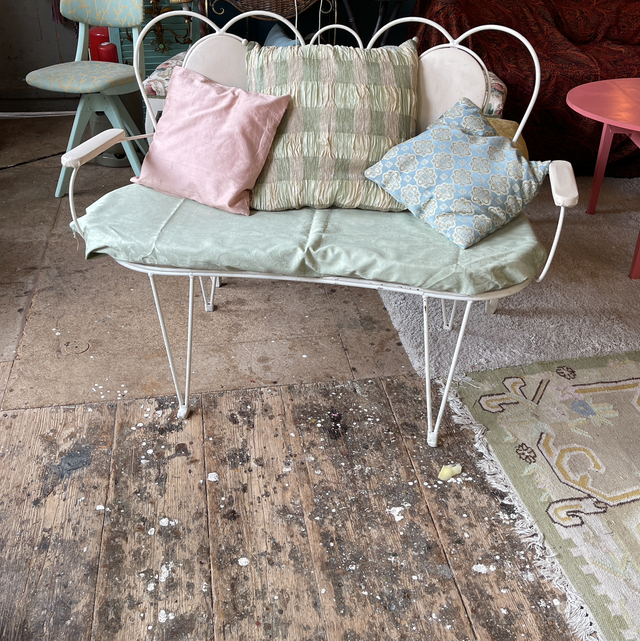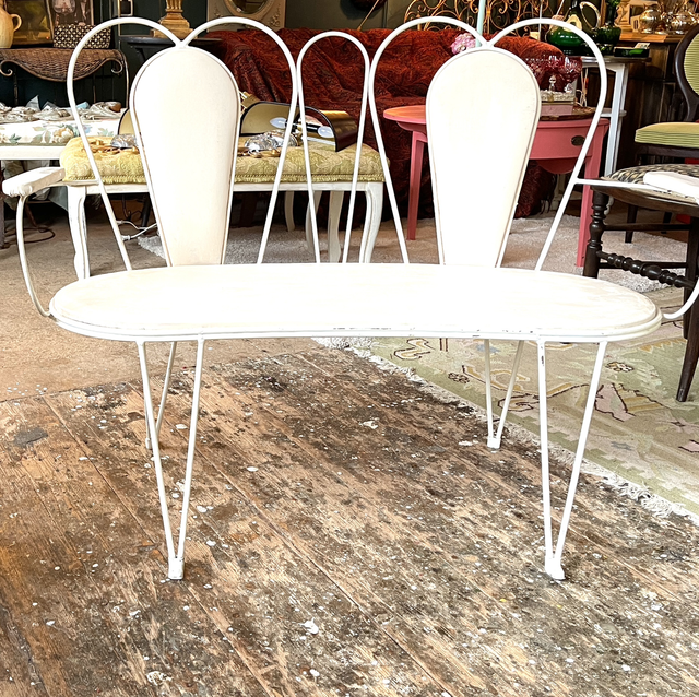 Weiße Mid-Century Gartenbank, Küchenbank aus Metall, Designer Bank #MathieuMategot ist ein französischer Designer, Architekt und Künstler