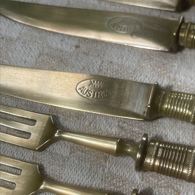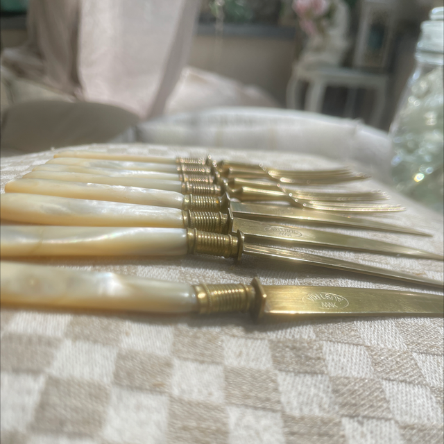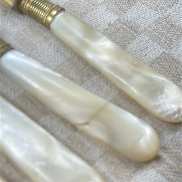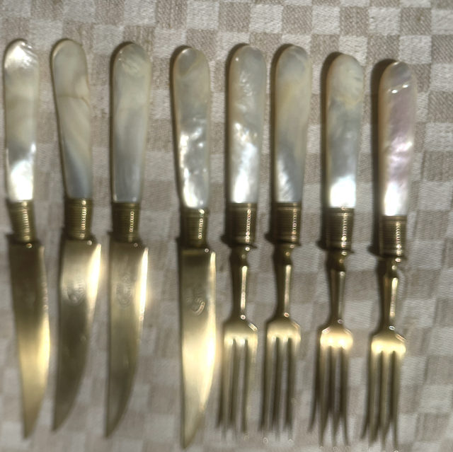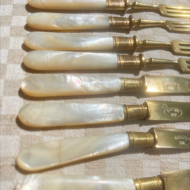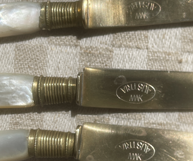 antikes Perlmuttbesteck 8-teilig mit Bronze Klinge aus Österreich . L: 16 cm , B: 1,5 cm . Ein Perlmuttgriff ist geklebt ( siehe Foto). WKAustria. Antiquitäten im Freudenhaus Interieurs