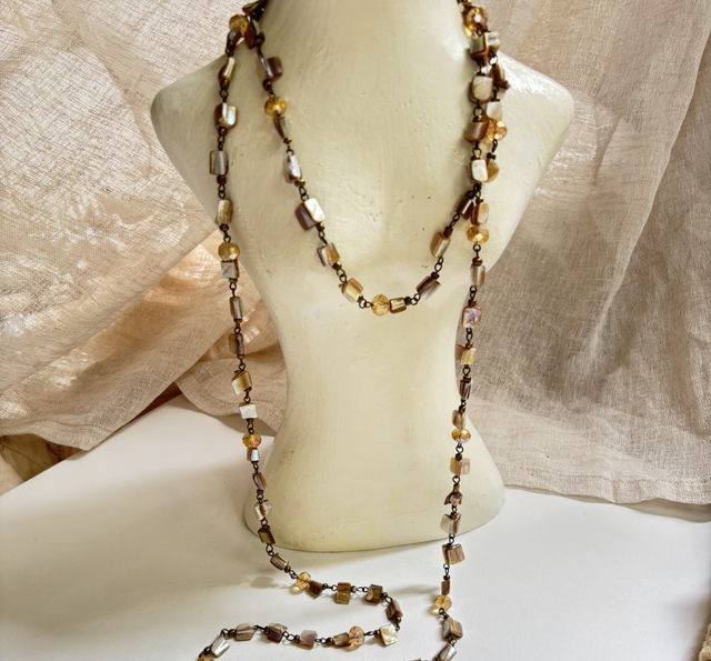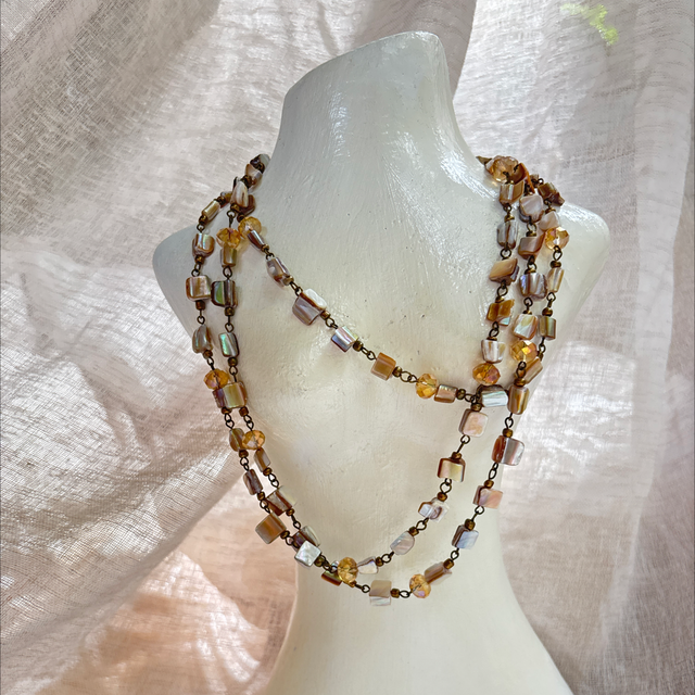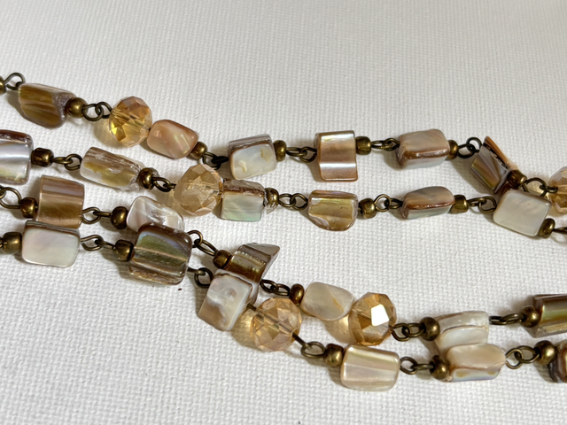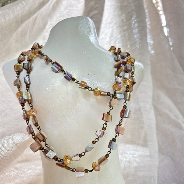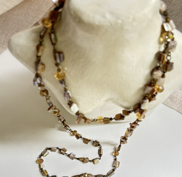 Perlmuttkette mit kugeligen Kristallen. Kann lang getragen werden oder freifach gehängt L: 72 cm , B: 1 cm