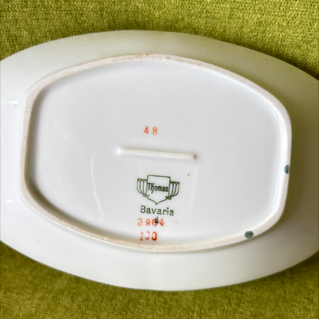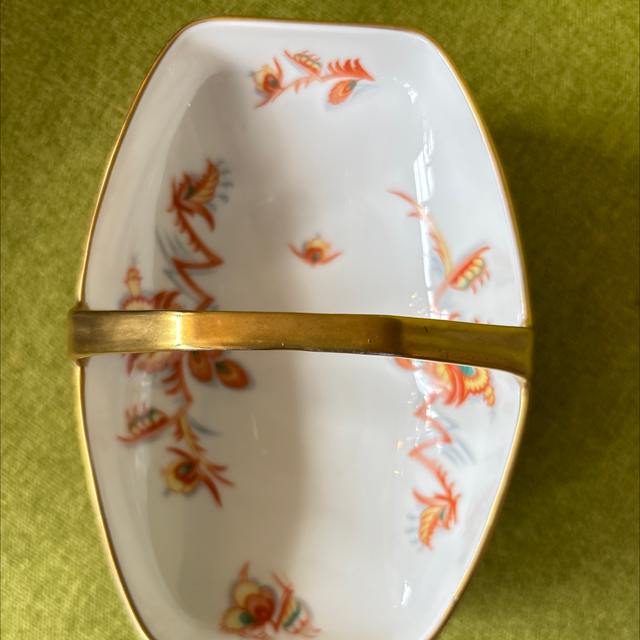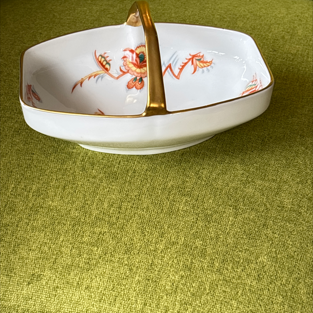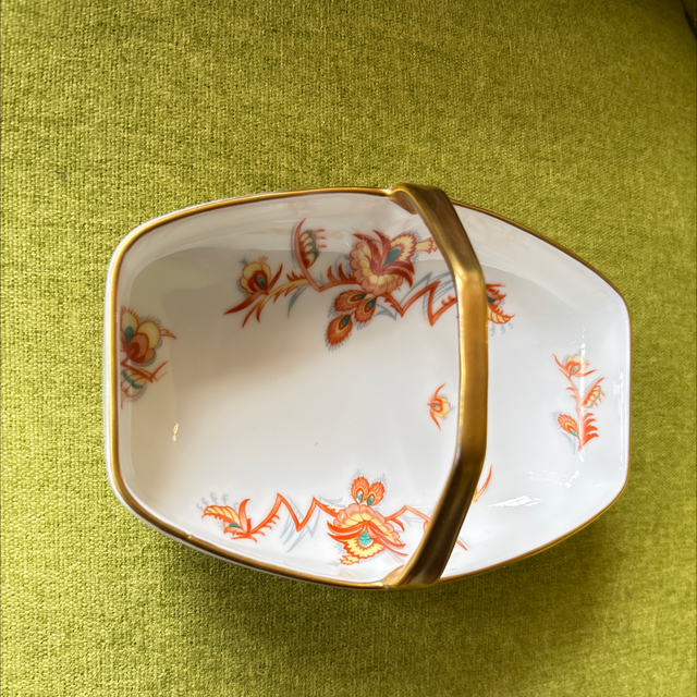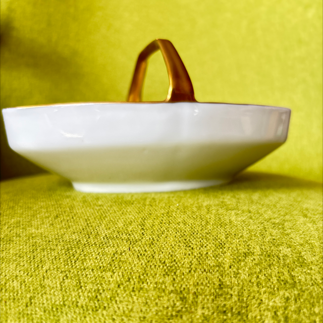 Porzellanschale mit Henkel . Art Déco Schale mit Henkel . B: 16 cm x 11 cm . H: 4 cm und mit Griff ist die H: 19 cm