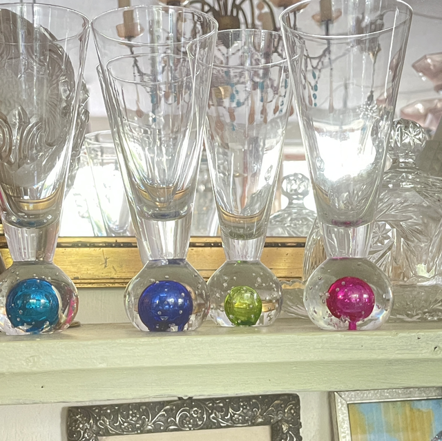 Handgefertigte Longdrinkgläser , Bierglas , Sektglas Wasserglas/ Digestiv mit Kugelfuß . Sehr besonders H: 18 cm B: 7 cm. Eine gute Geschenkidee sind diese einmalig gestalteten Vintage- Gläser sind ein Hingucker auf jeder Party.