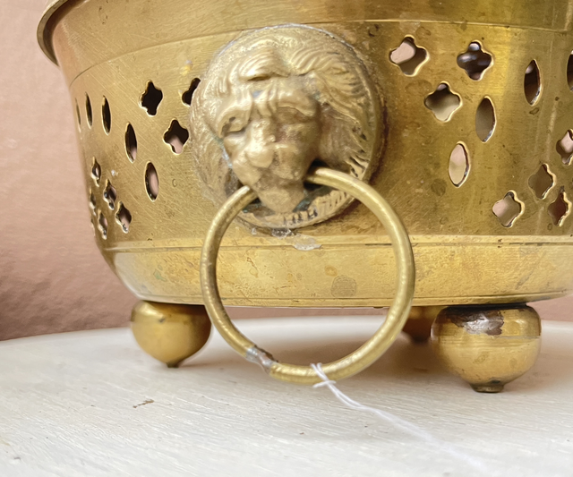 antikes Messingstövchen mit Löwenköpfen / Warmhalteplatte . Von Hand hergestellt