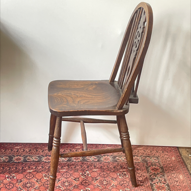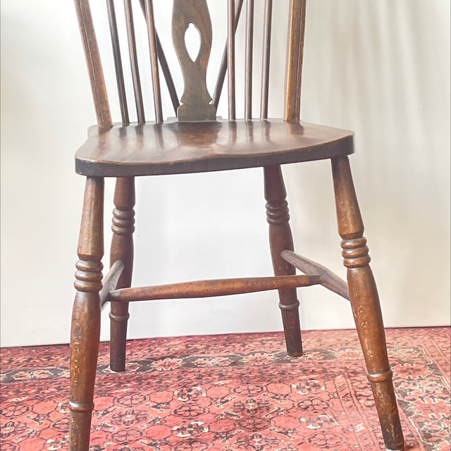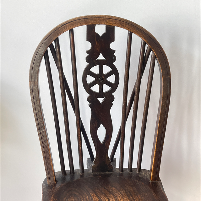 antiker englischer Windsor Stuhl mit original Patina. Esche, dunkel gebeizt. Holzstuhl mit Wölbung auf der Sitzfläche damit es bequemer ist. Original
