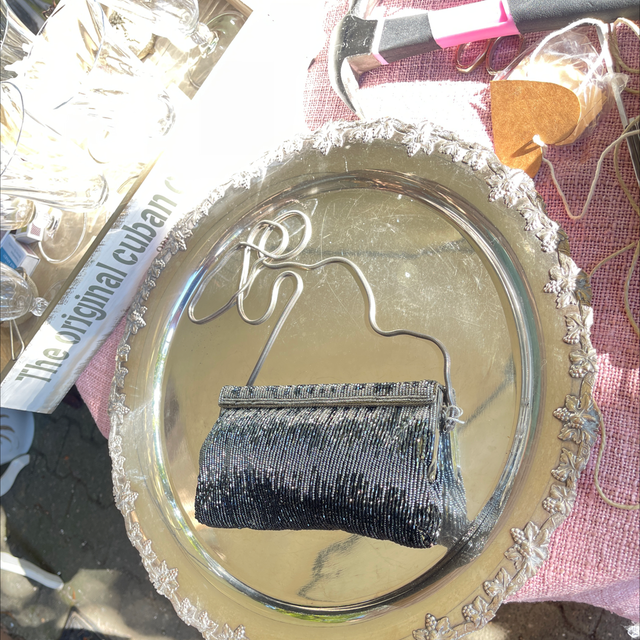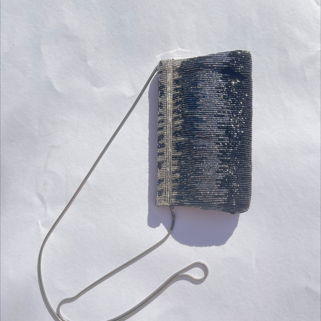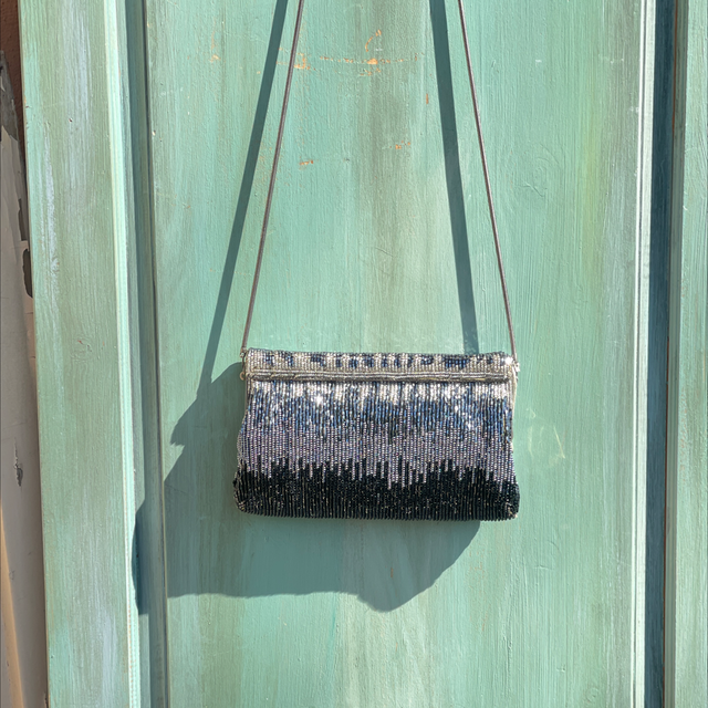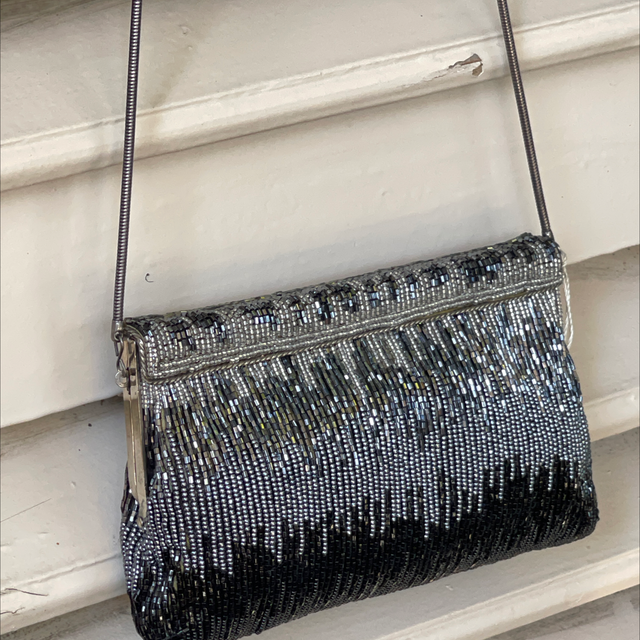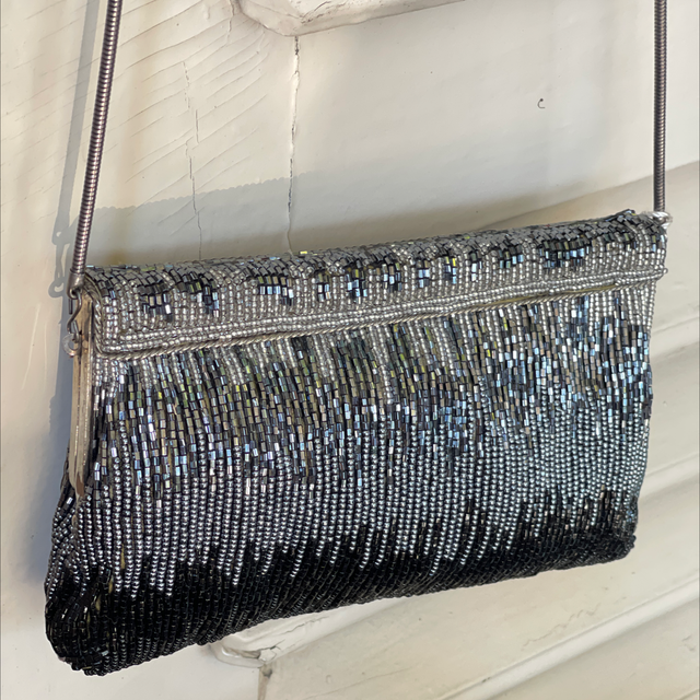 Mid-Century Tasche/ Abendtasche mit silber grau schwarzem Glasperlen Farbverlauf
