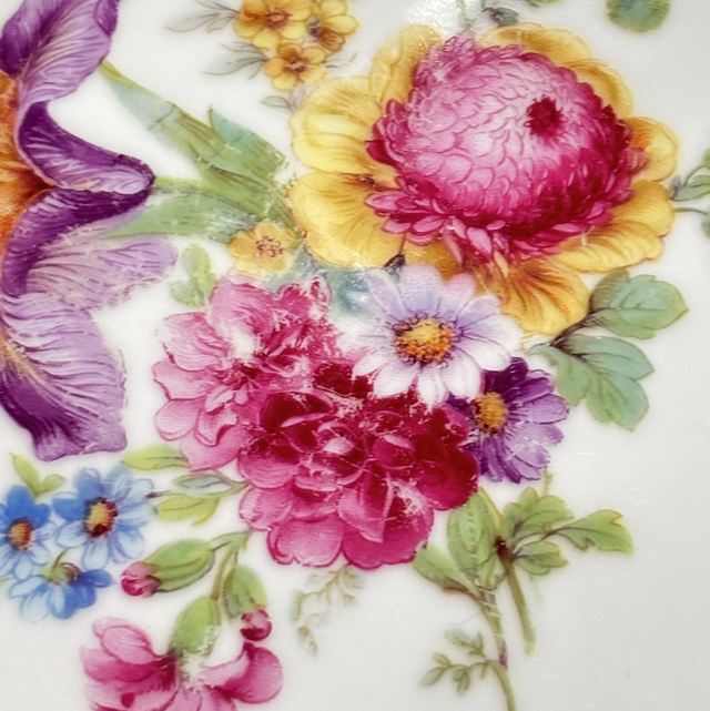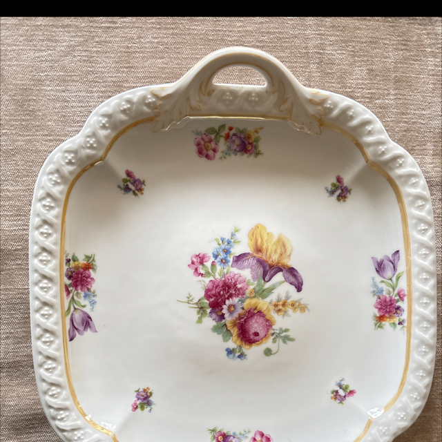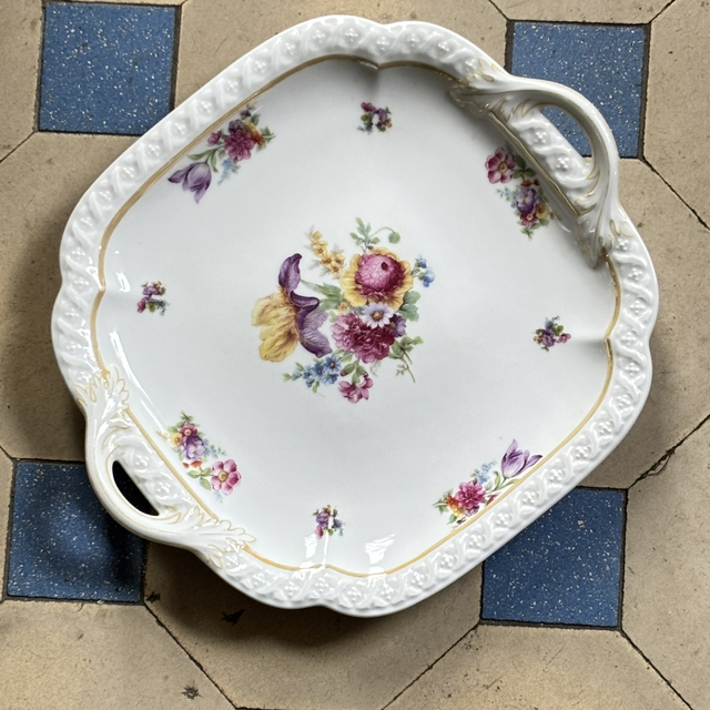 Grosser Teller mit Griffen und handgemalten Blumen aus Porzellan von Hutschenreuther Hohenberg Germany