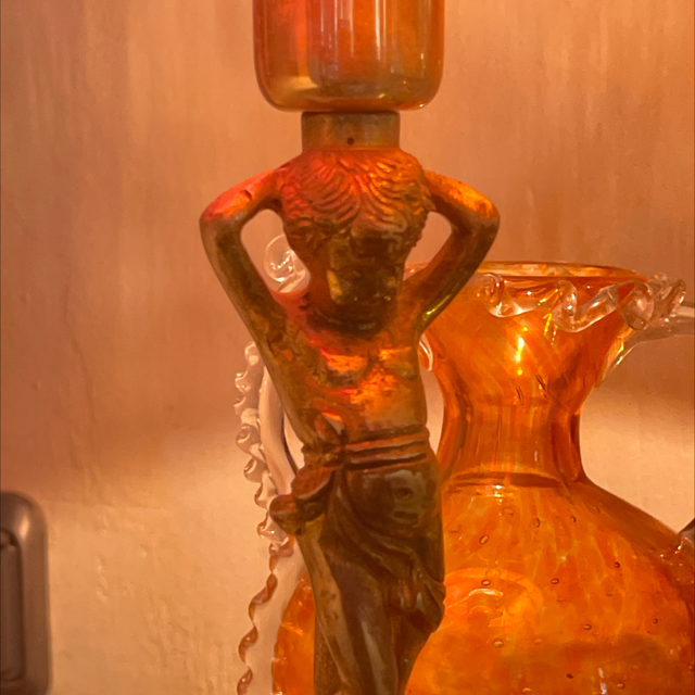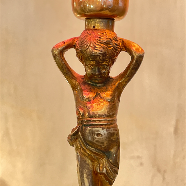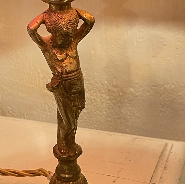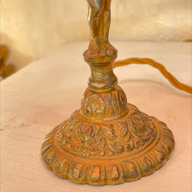 Tischleuchte Bronze antik Junge mit handgenähtem Schirm