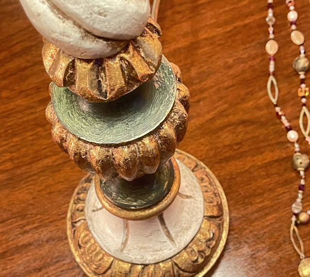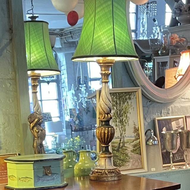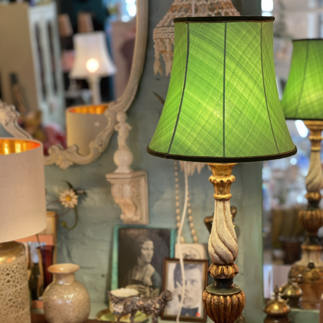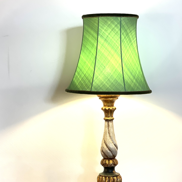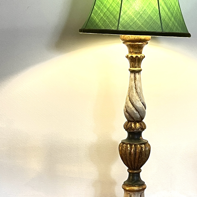 Tischleuchte aus Holz gedrechselt und handbemalt , inclusive grünem Schirm und hergestellt ist die Lampe in Florenz