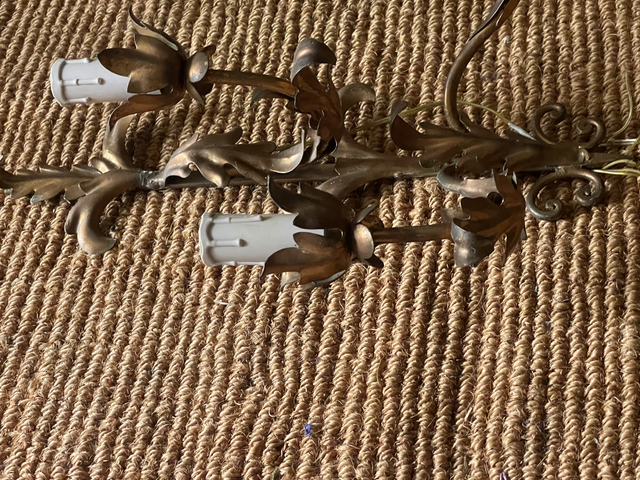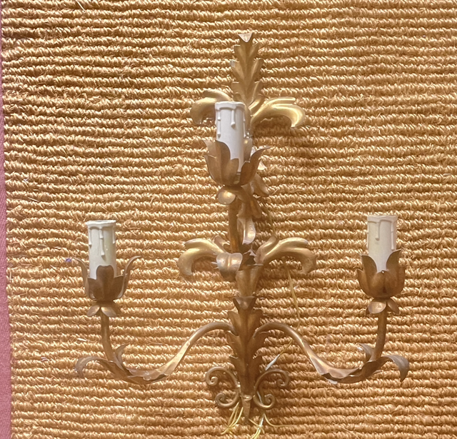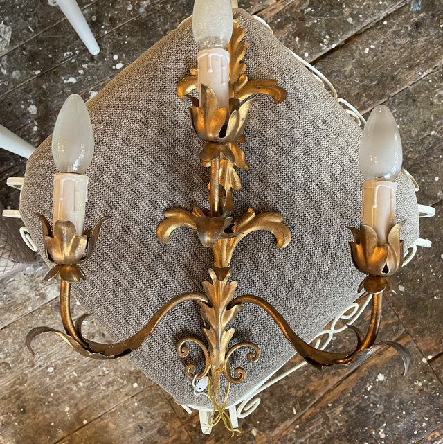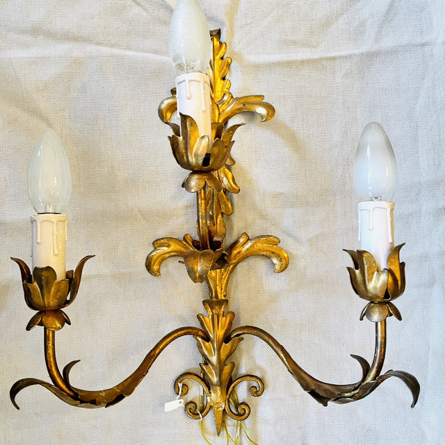 Antike Wandlampen / Paar geschmiedete Blätter, Metall vergoldet aus Italien Palazzo- Stil, 3- flammig, E14 Watt