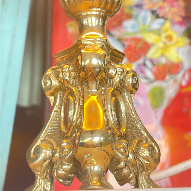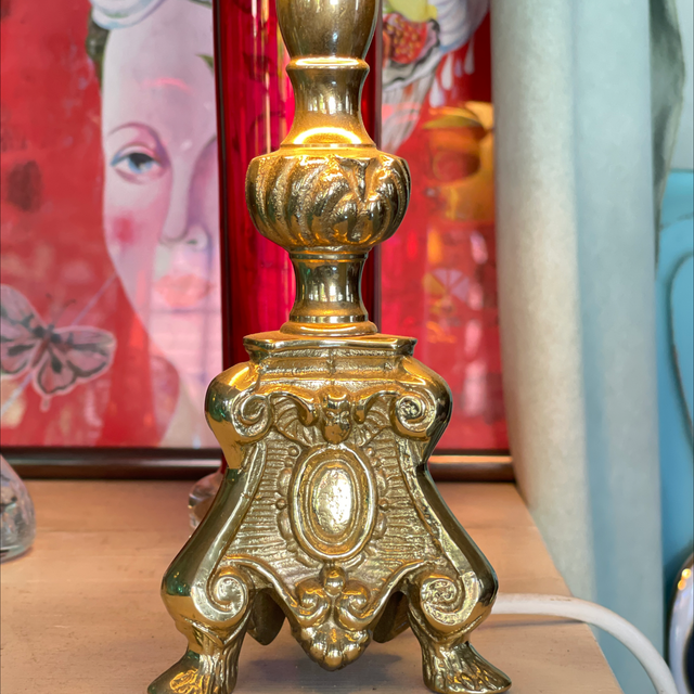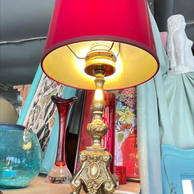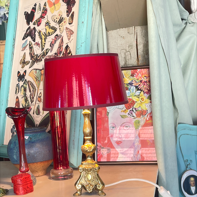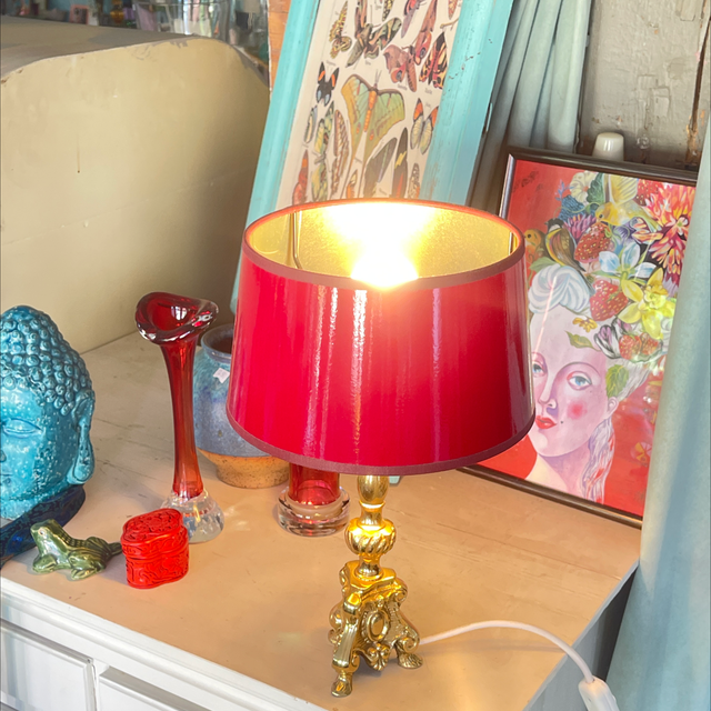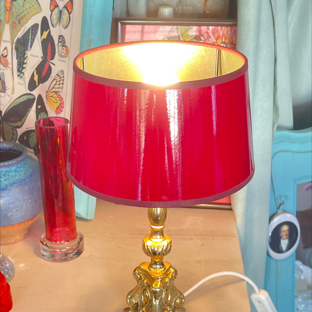Kleiner Messingleuchter mit rotem Lackschirm der innen goldfarben ist und dadurch ein wunderbares Licht zaubert