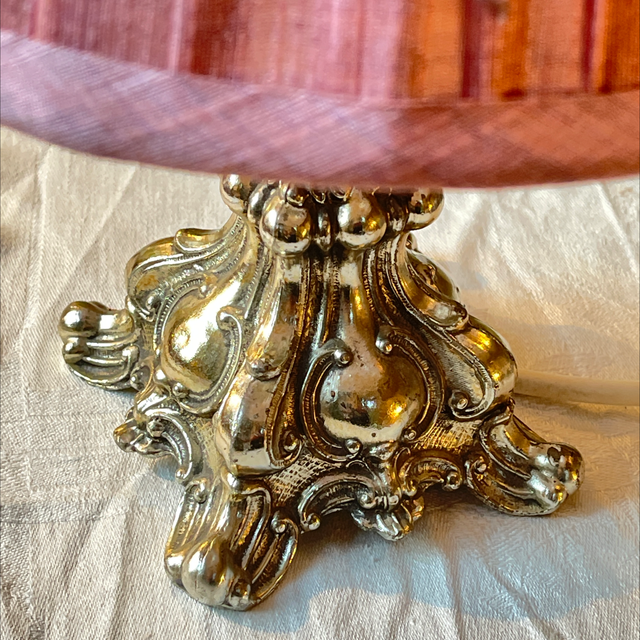 Tischlampe Metallfuss Silberonamentik mit Glaselemet GH: 34 cm. Der Schirm kann im Wiesbadener Antik & Vintageladen variiert werden