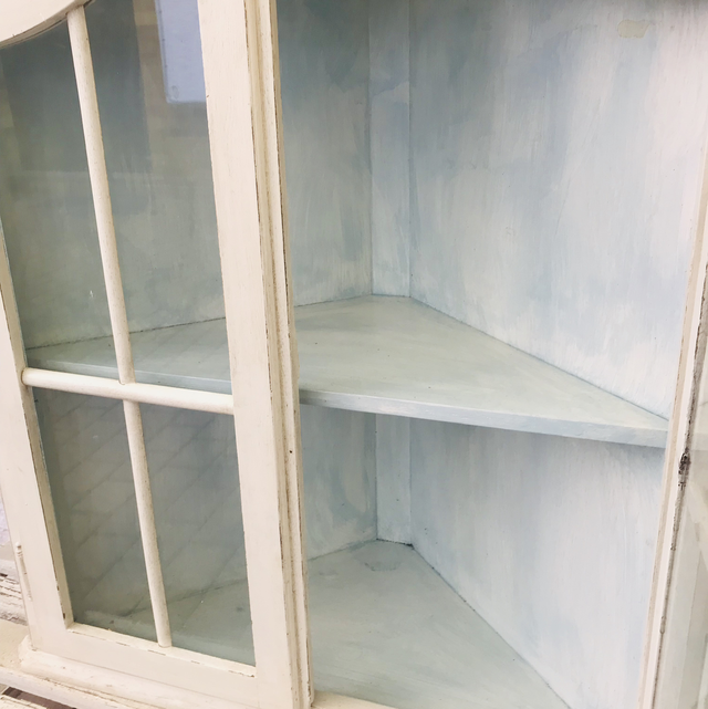 Antike Holzvitrine mit Glasscheiben und 2 Etagen innen blau gestrichen und sie ist eine Eck Vitrine.