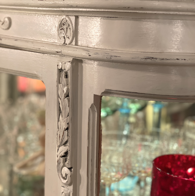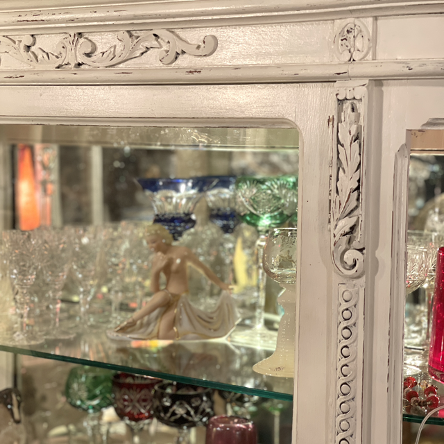 Antike weiße Glasvitrine aus Holz, die hintere Wand ist verspiegelt. Drei- seitig Glas mit geschnitzten weißen Ornamenten. Mit 4 Ebenen aus stabilen Glasböden. B: 140 cm H: 162 cm T: 40 cm