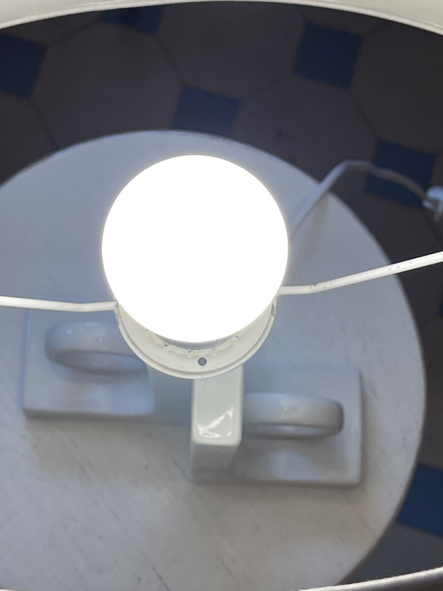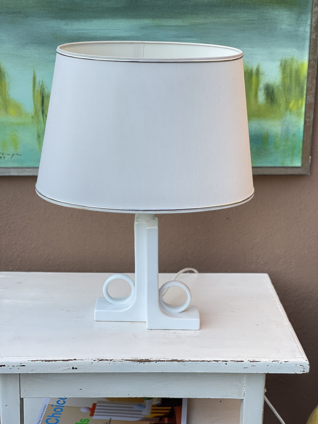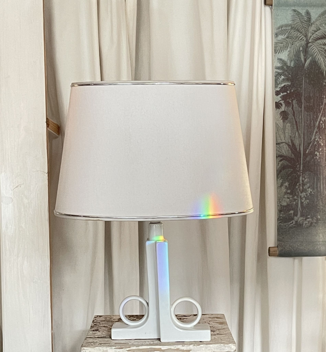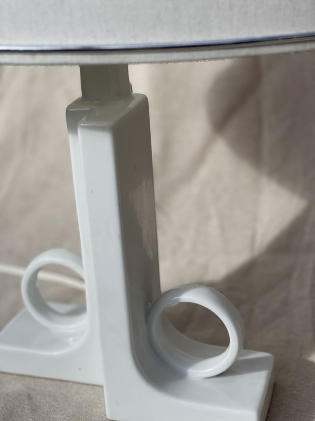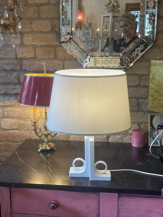 Origineller Porzellanfuß mit weißem Lackschirm