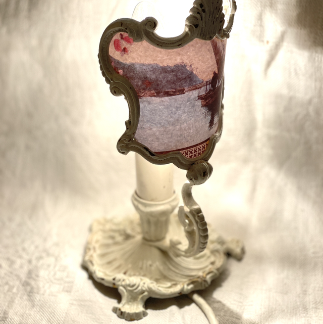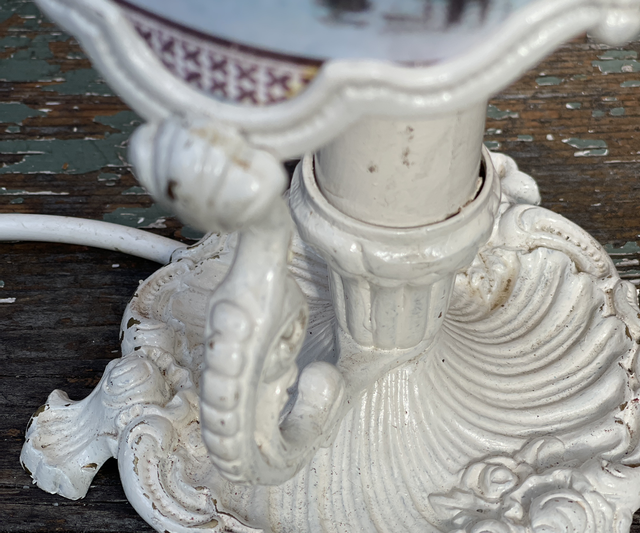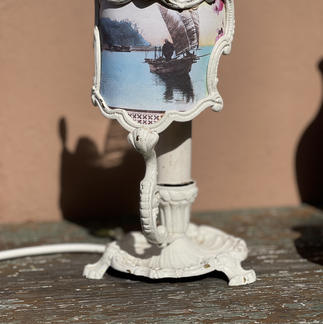 Weiße Tischlampe aus Metall mit Halbschirm . Der Schirm hat ein Segelschiff auf dem Meer schwimmend.
